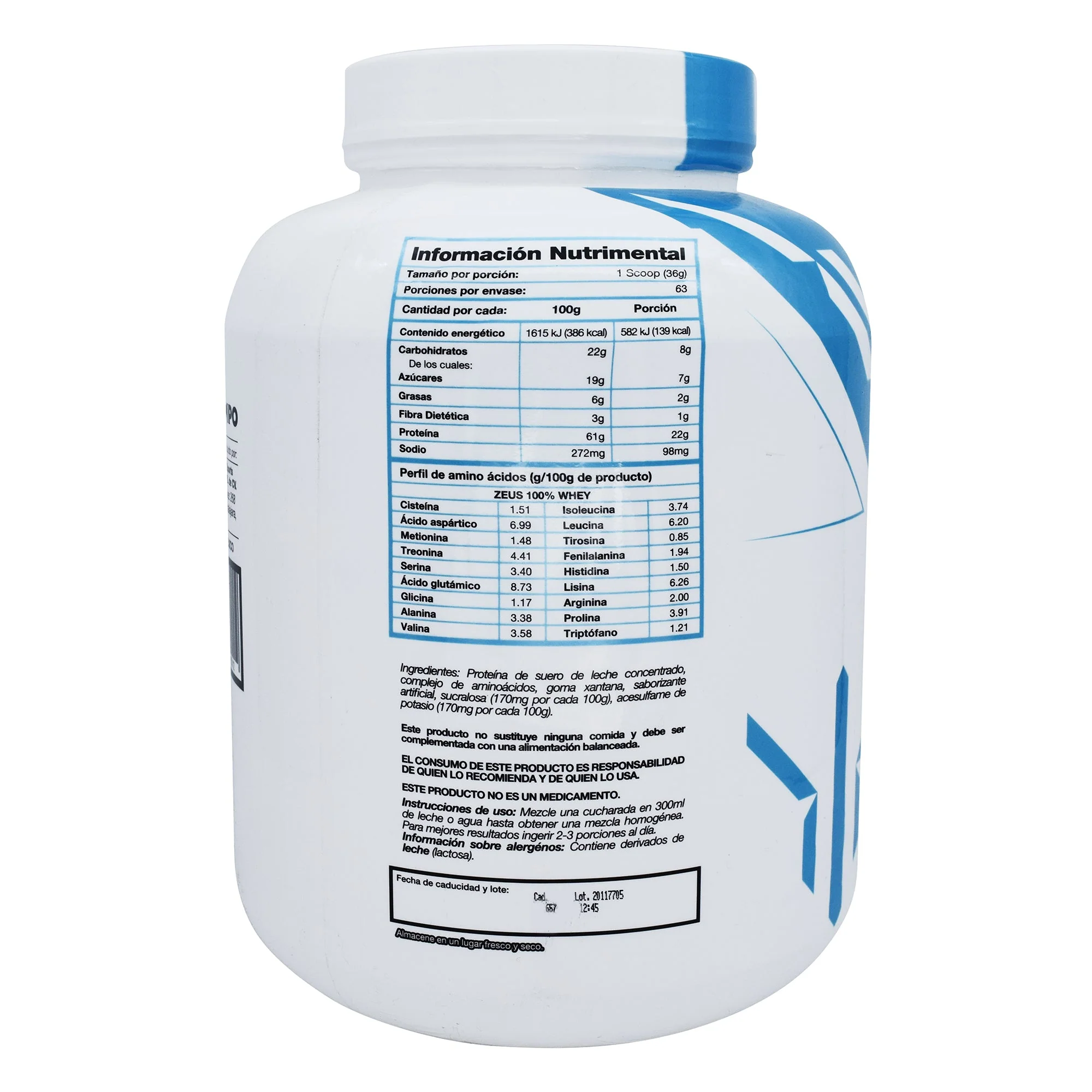 Proteí­­na de suero de leche concentrado, complejo de aminoácidos, goma xantana, saborizante artificial, sucralosa, acesulfame de potasio