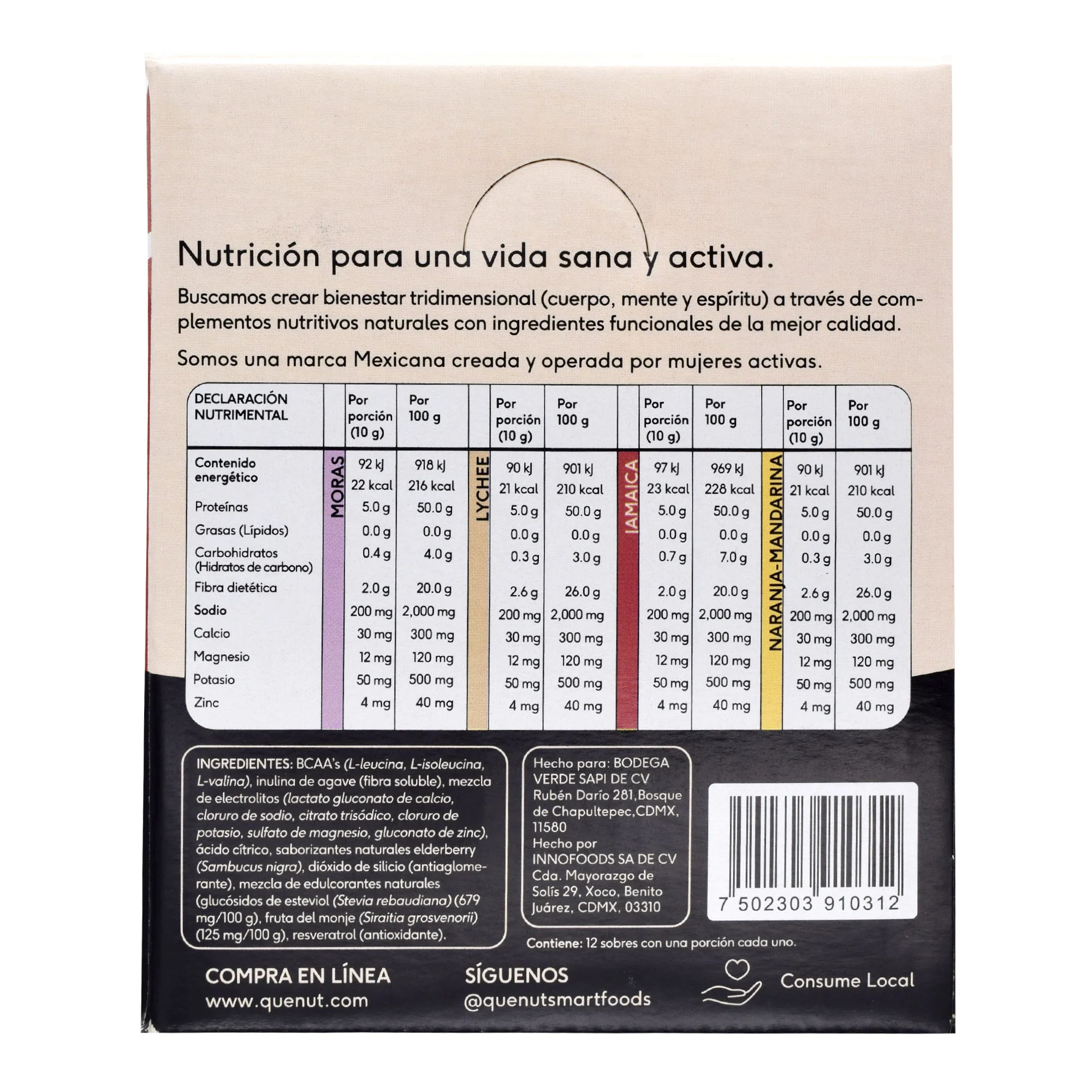 L-leucina, L-isoleucina, L-valina, inulina de agave, mezcla de electrolitos (lactato gluconato de calcio, cloruro de sodio, citrato trisodico, cloruro de potasio, sulfato de magnesio, gluconato de zinc), acido citrico, saborizantes naturales y artificiales, mezcla de edulcorantes naturales