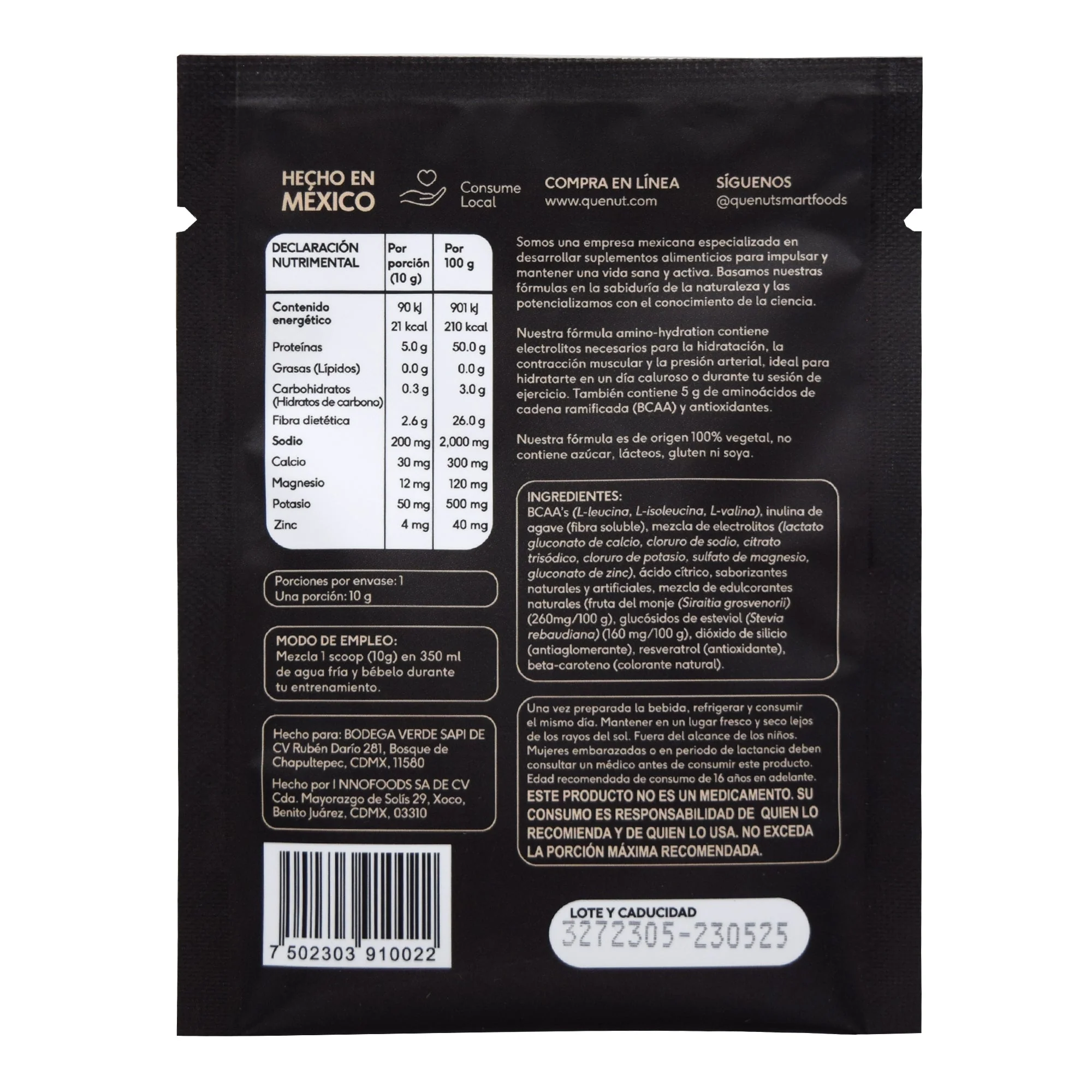 L-leucina, L-isoleucina, L-valina, (Lactato gluconato de calcio, cloruro de sodio, citrato trisodico, cloruro de potasio, sulfato de magnesio, gluconato de zinc), acido citrico, saborizantes naturales y artificiales, mezcla de edulcorantes naturales