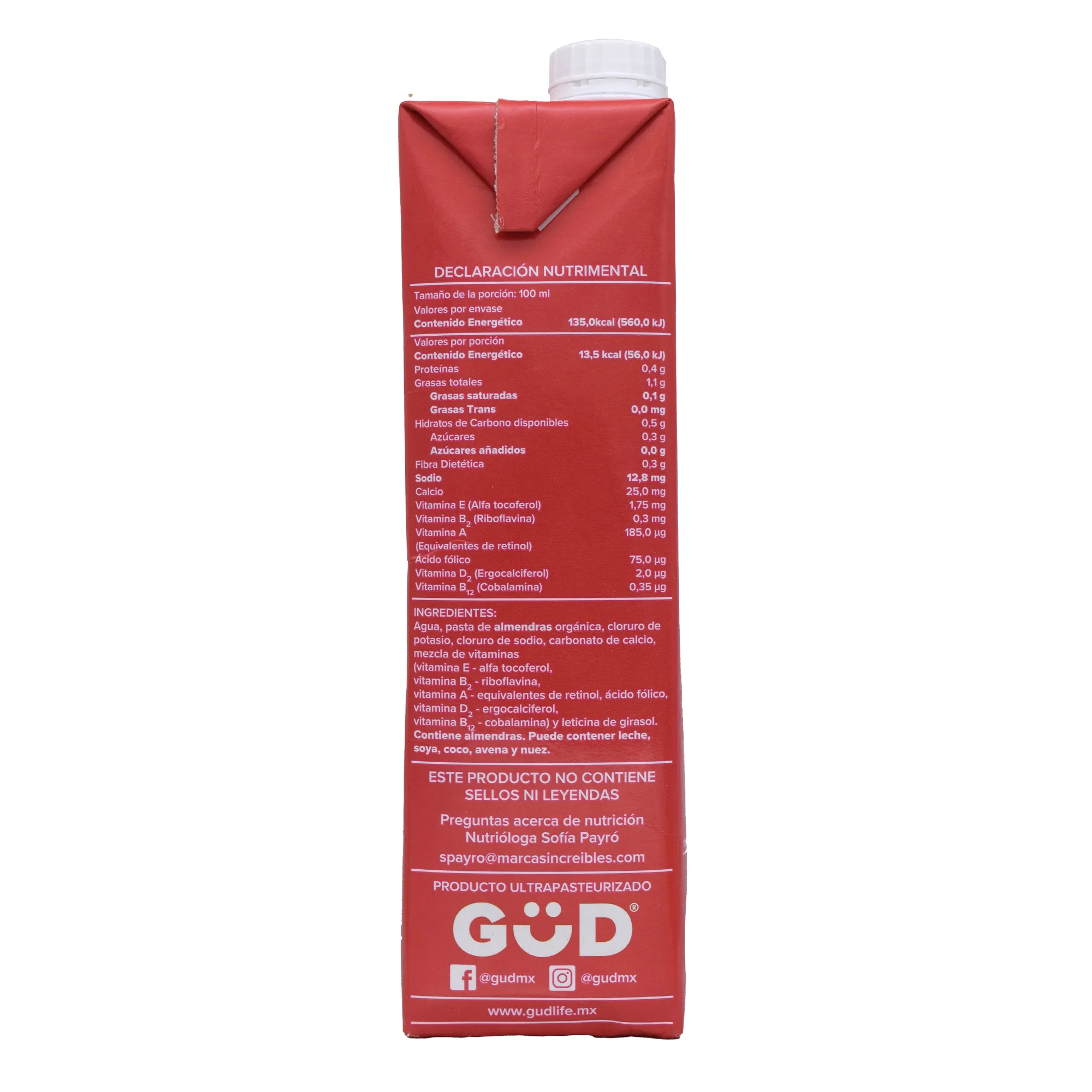 Agua, pasta de almendras orgánica, carbonato de calcio, cloruro de sodio, mezcla de vitaminas (vitamina E ‚¬€œ alfa tocoferol, vitamina B2 ‚¬€œ riboflavina, vitamina A ‚¬€œ equivalentes de retinol, ácido fólico, vitamina b12 ‚¬€œ cobalamina) y lecitina de girasol