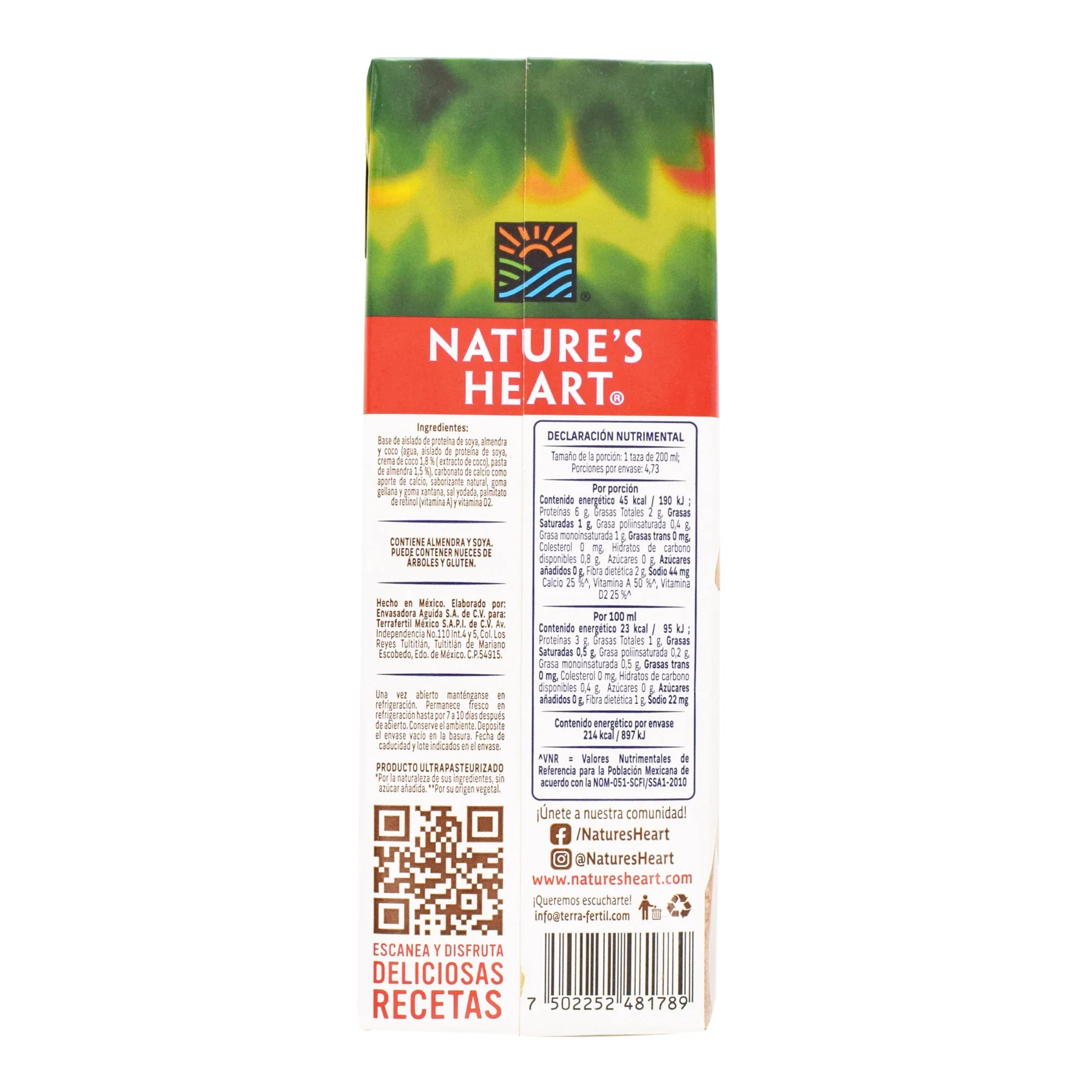Base de soya, almendra y coco (agua, semillas de soya, pasta de almendra, crema de coco, extracto de agua de coco, goma xantana y goma guar como estabilizante), fosfato tricálcico como estabilizante y aporte de calcio, fosfato dipotásico, sal yodada, saborizante natural, goma xantana y harina de í±ame, vitamina A y D