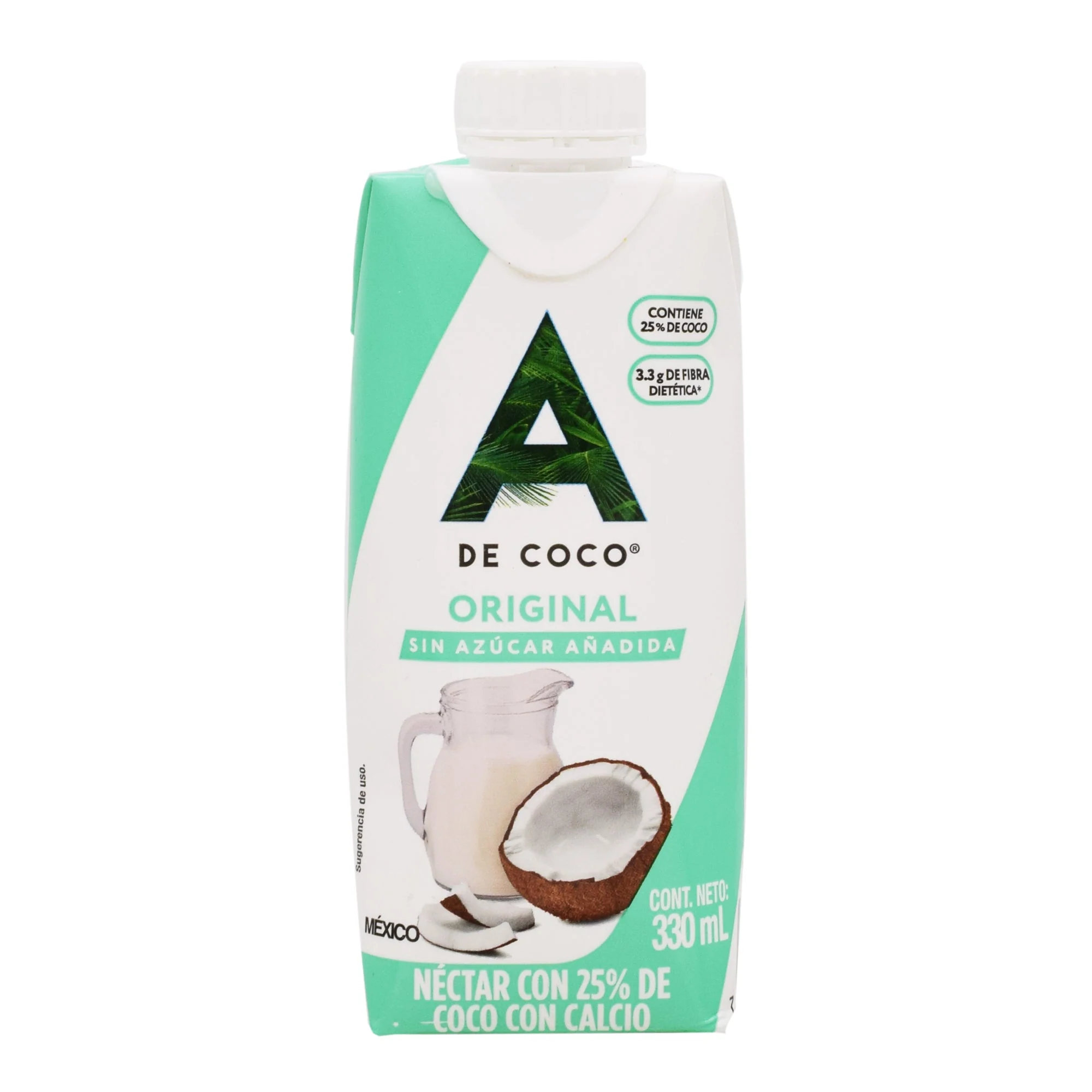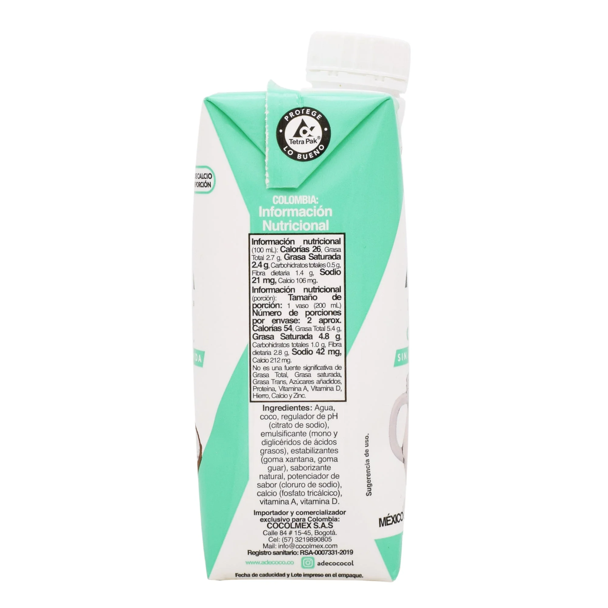 Agua, coco, regulador de PH, lecitina, goma xantana, gellana y aguar, saborizante natural, potenciador de sabor, calcio, vitamina A y D