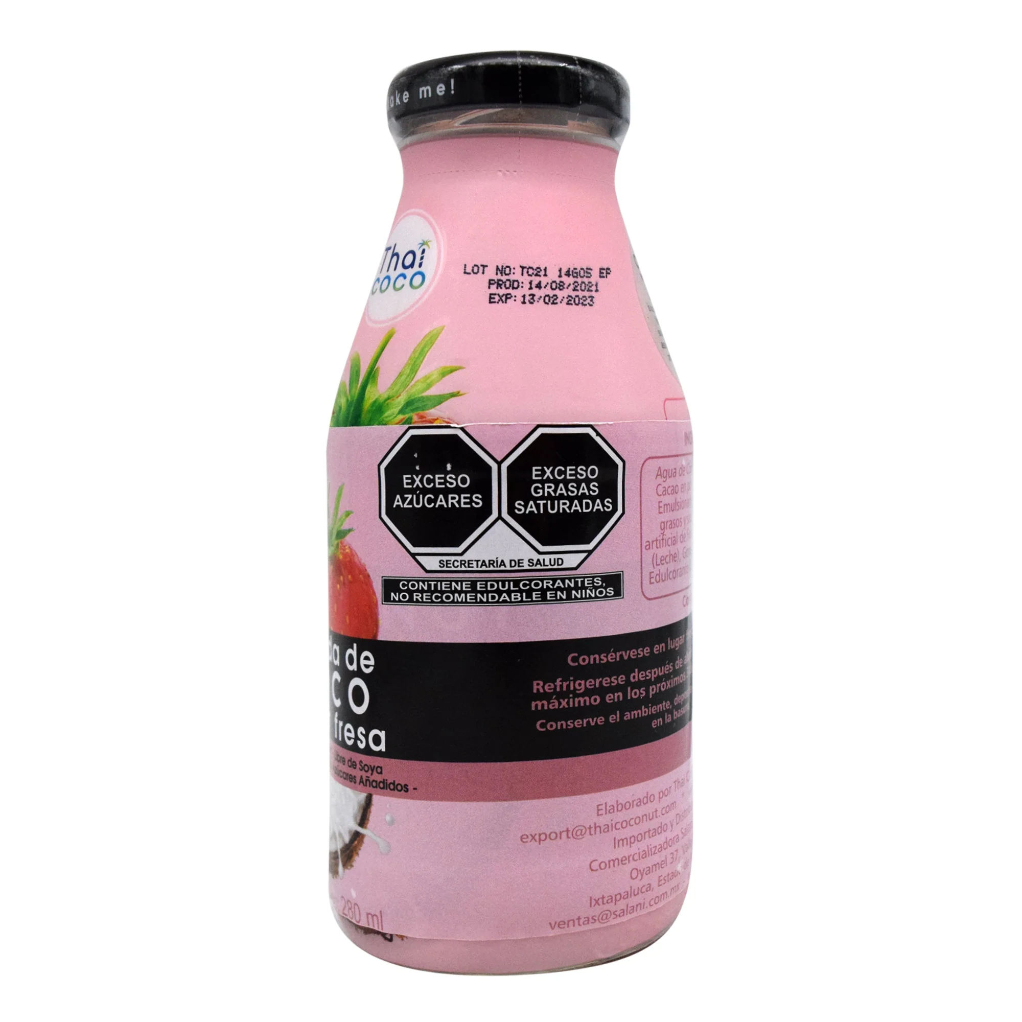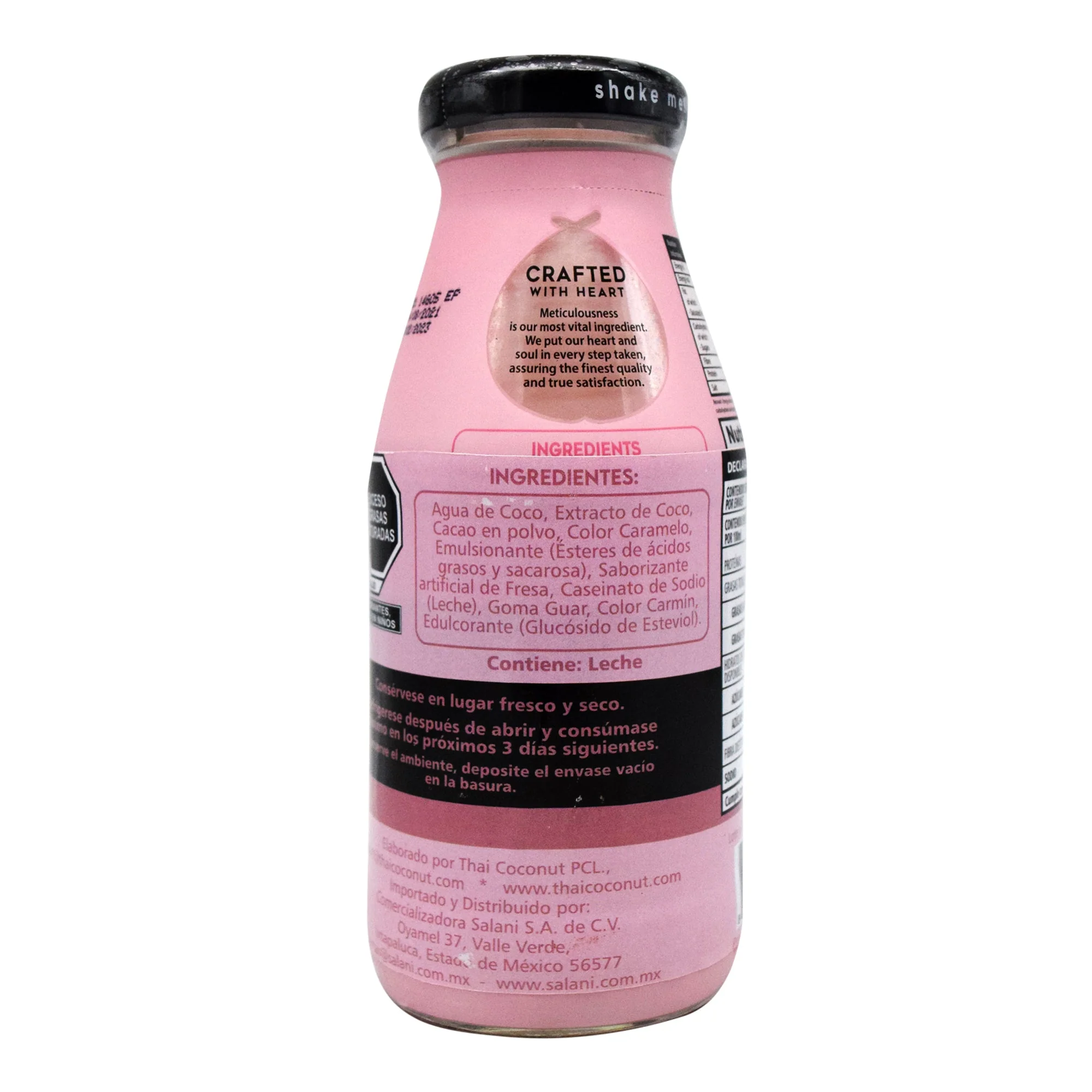 Agua de coco, extracto de coco, cacao en polvo, color caramelo, emulsionante (esteres de ácido graso y sacarosa), caseinato de sodio (leche), saborizante artificial de fresa, goma guar, edulcorante (glucosido de esteviol)