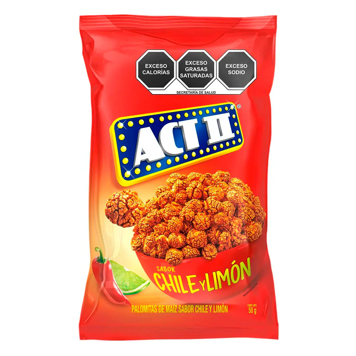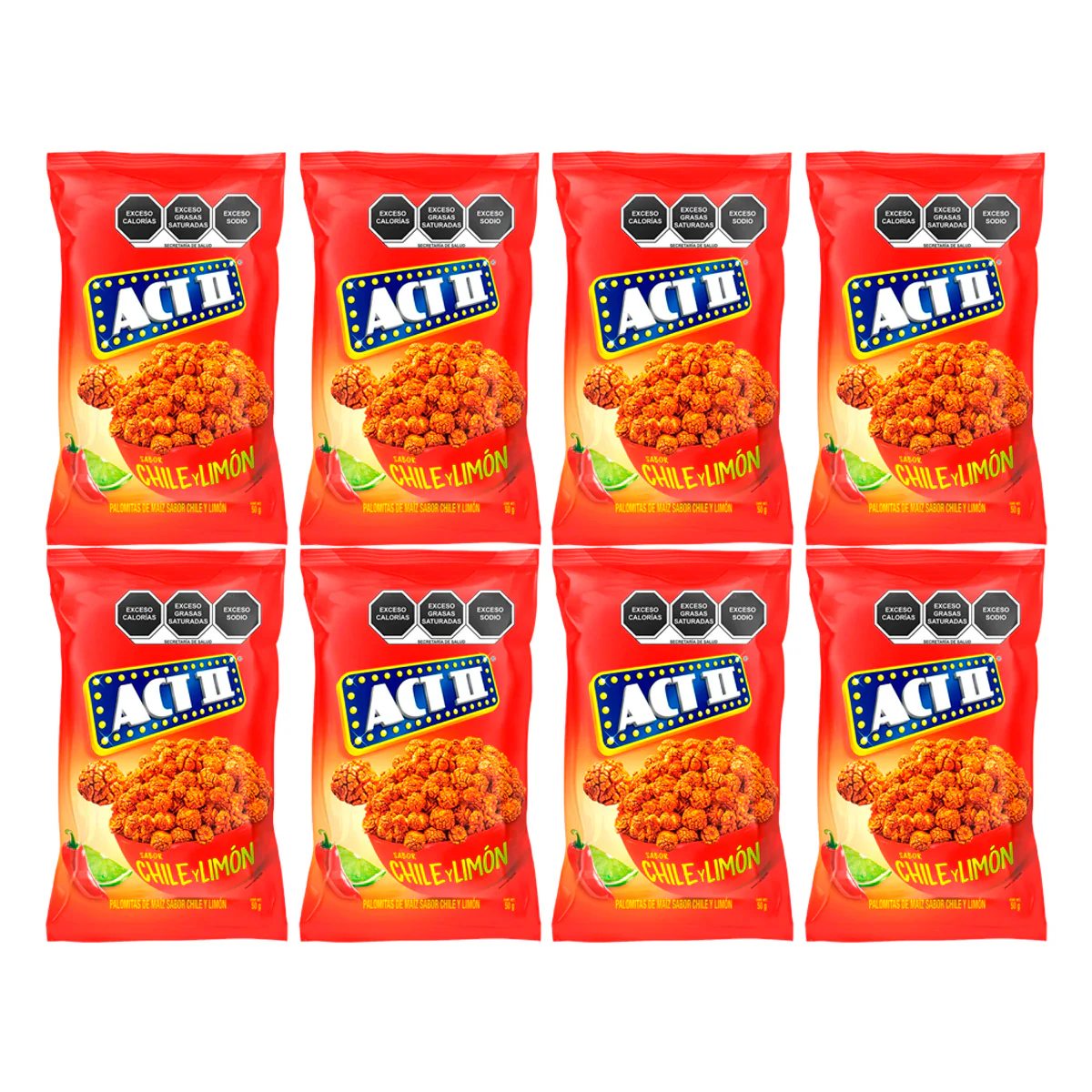 Palomitas De Maíz Act Ii Chile Y Limón En Presentación De 8 Paquetes De 50 Gramos Un Delicioso Sabor Para Disfrutar, Ideal Para Cumplir Tus Antojos. Producto De Confitería.