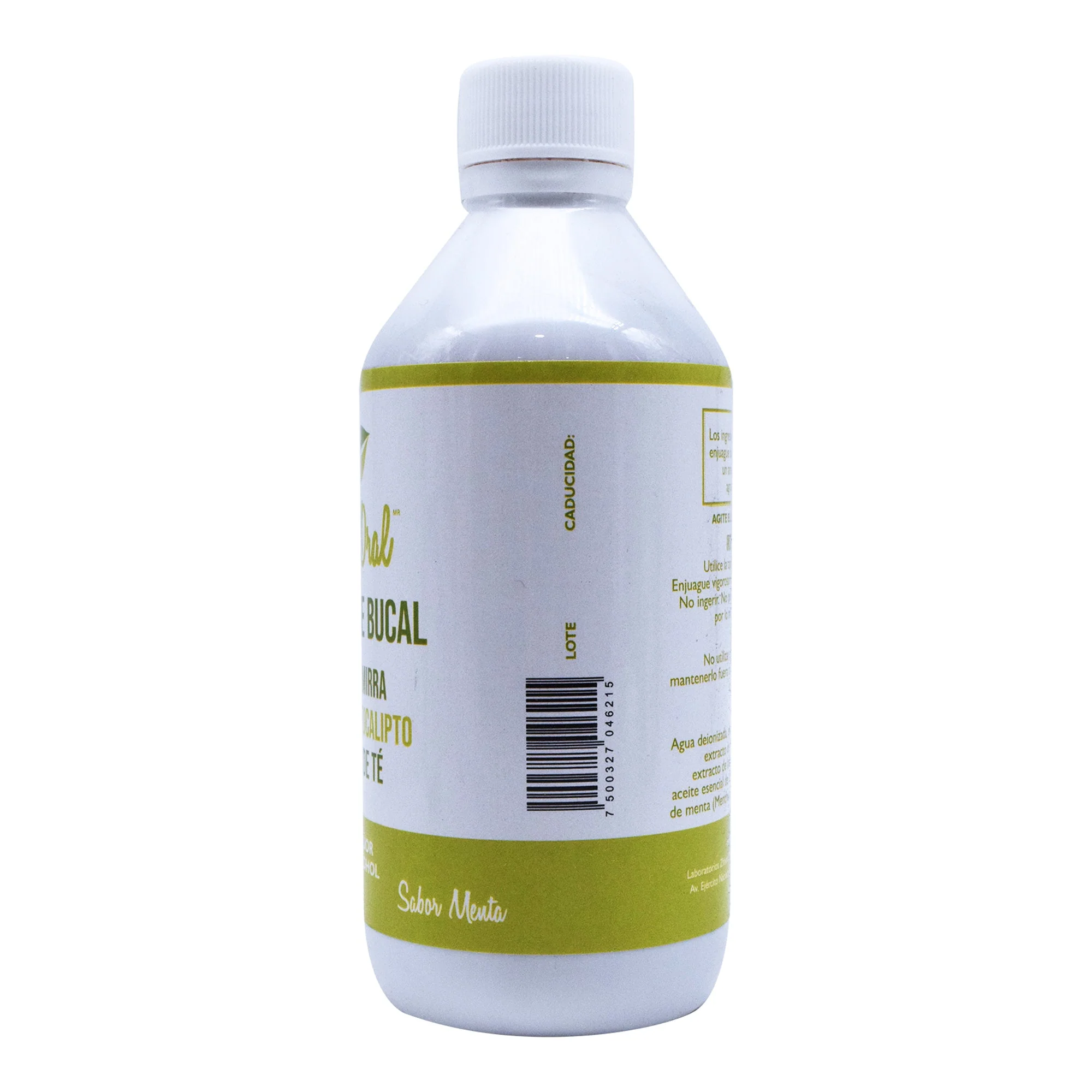 Agua de ionizada, extracto de té verde, extracto de mirra, extracto de árbol de té, aceite esencial de menta, aceite esencial de eucalipto y stevia rebaudiana