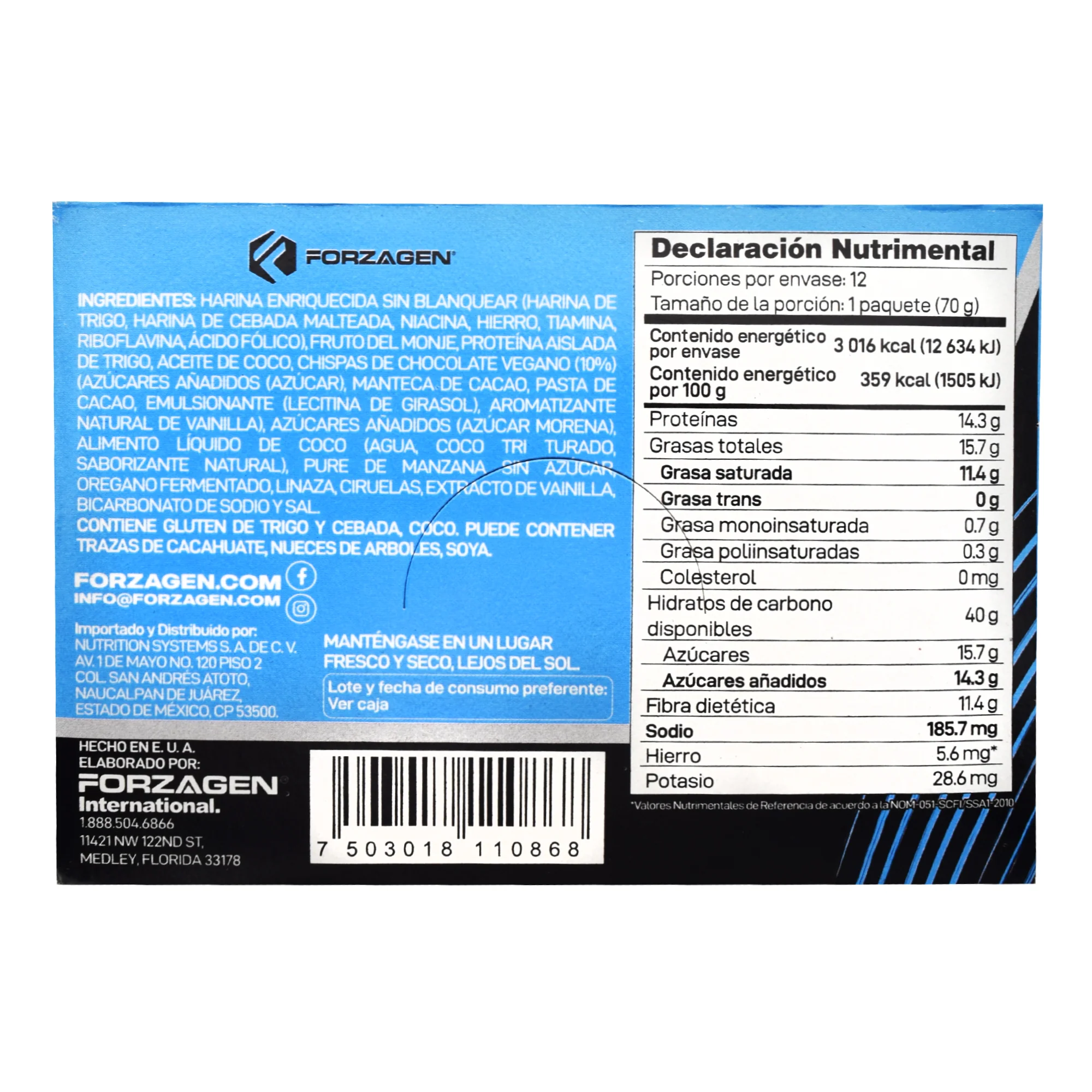 Harina de trigo, harina de cebada, malteada, niacina, hierro, tiamina, riboflavina, ácido fólico, fruta del monje, proteína aislada de trigo. Aceite de coco, chispas de chocolate, azíºcares aí±adidos, manteca de cacao, pasta de cacao, emulsionante, aromatizante natural de vainilla, alimento líquido de coco, pure de manzana sin azíºcar, orégano fermentado, linaza, ciruelas, extracto de vainilla, bicarbonato de sodio y sal