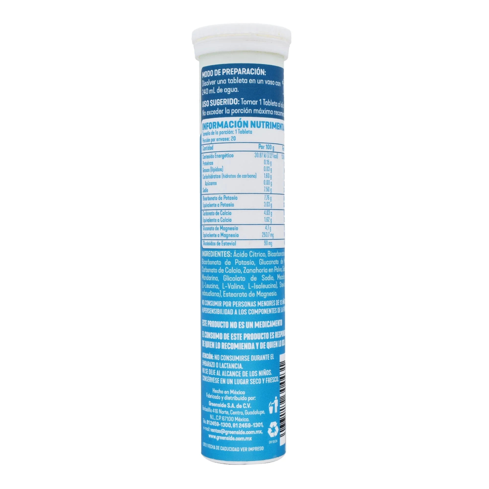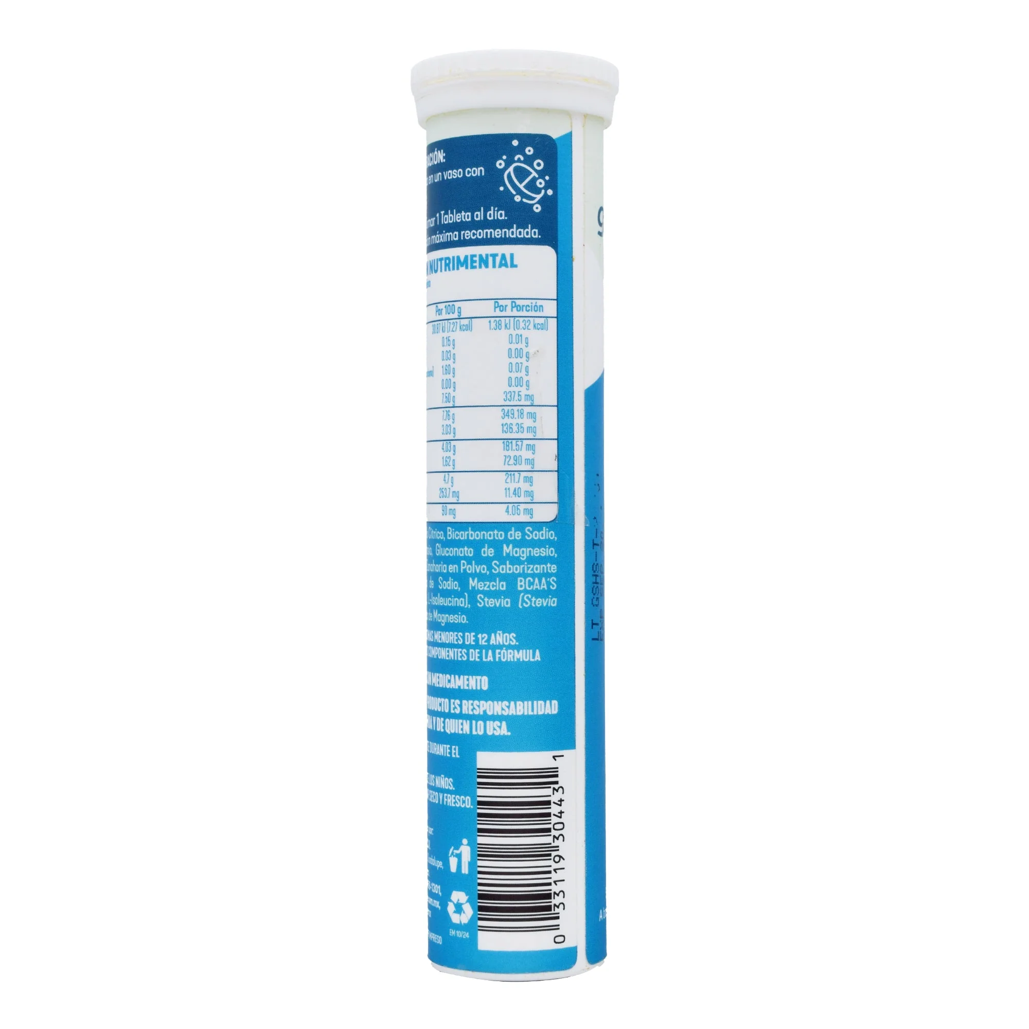 Ácido cítrico, bicarbonato de sodio, bicarbonato de potasio, gluconato de magnesio, carbonato de calcio, zanahoria en polvo, saborizante mandarina, glicolato de sodio, BCAA´S, stevia, estearato de magnesio