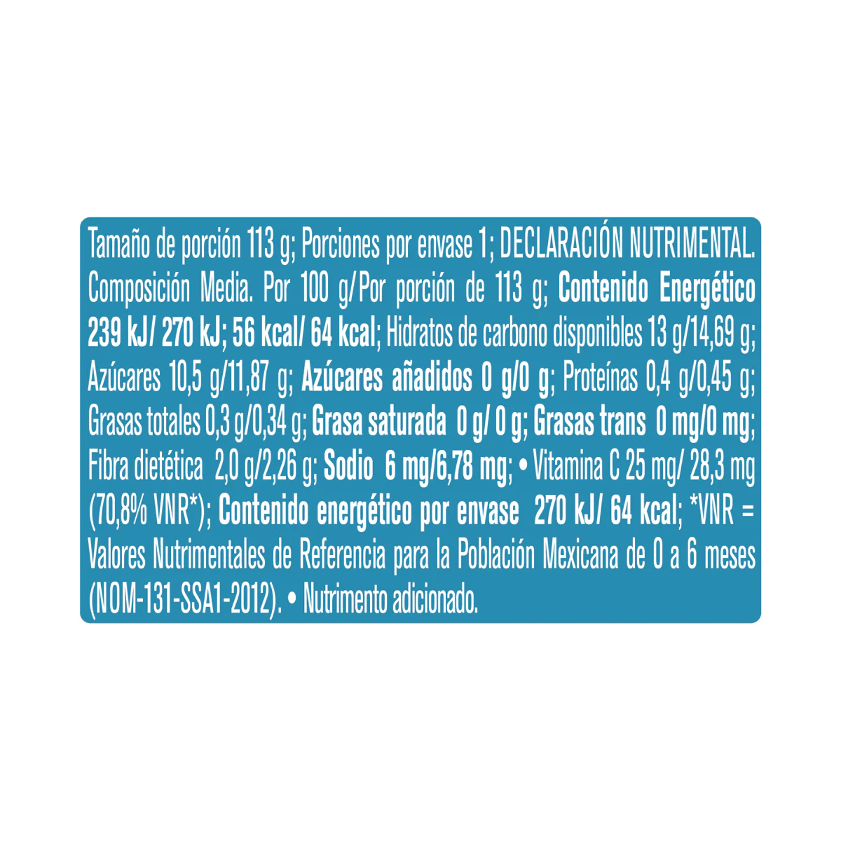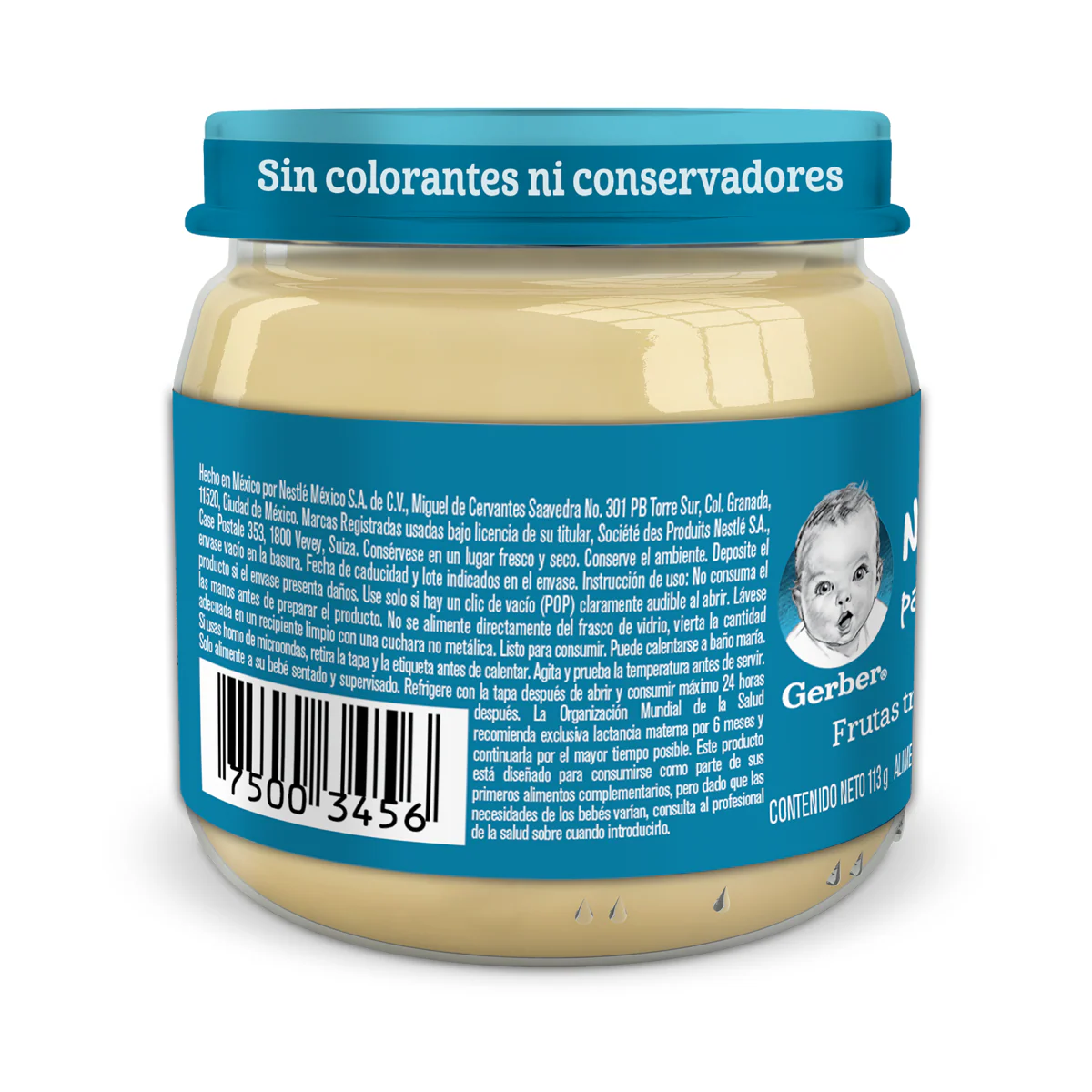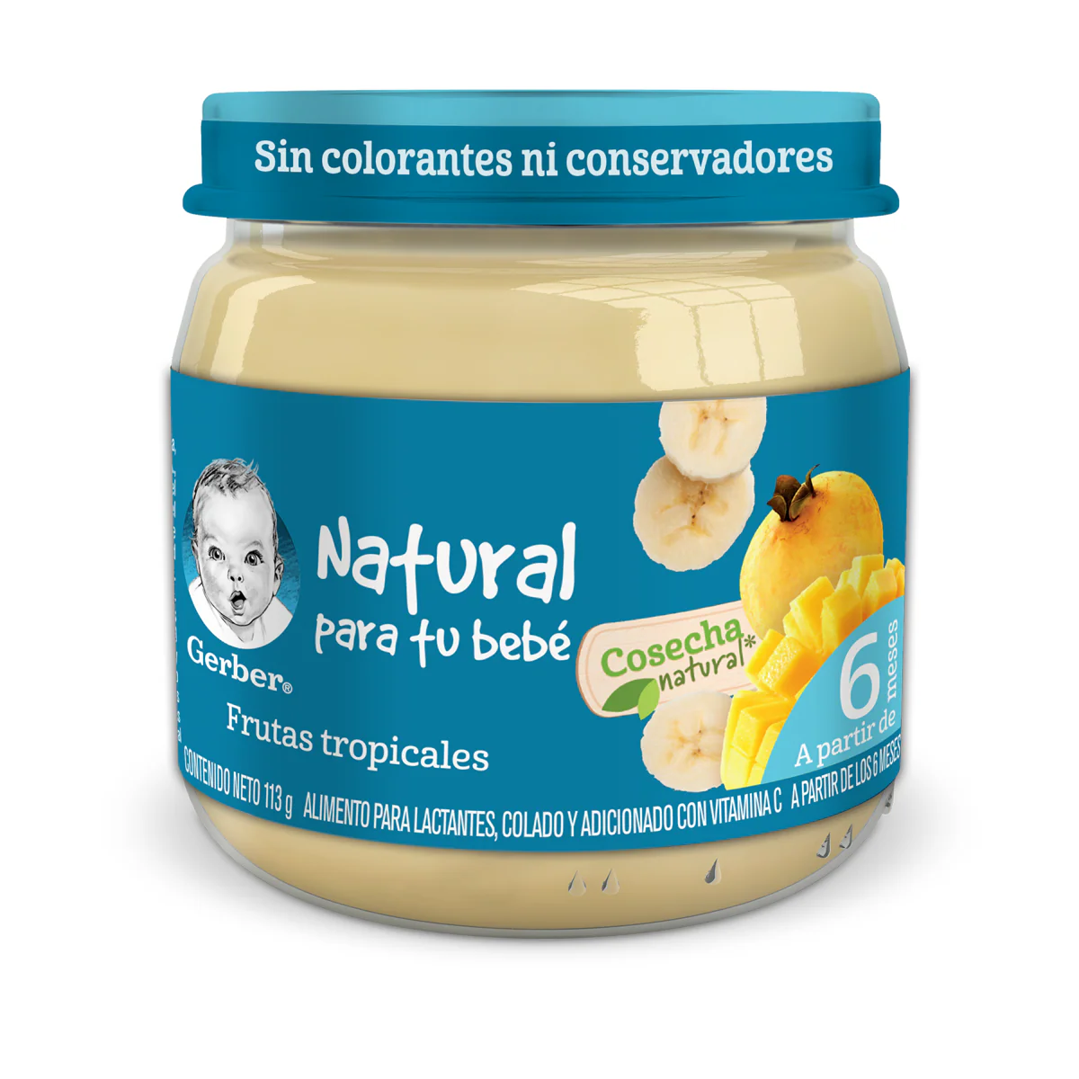 Papilla para bebé Gerber Etapa 2 sabor frutas tropicales (alimento para bebé de 6 meses en adelante). Las papillas de 6 meses Gerber son la comida para bebé: -Fortificada con Vitamina C y hierro. -Variedad de mezcla de sabores de Gerber. -Porciones adecuada a la etapa de tu bebé para satisfacer su creciente apetito. -Sin saborizantes artificiales. -Sin colorantes artificiales. -Sin azúcar añadida. -Sin conservadores químicos. -Papilla de frutas 100% natural. Ayuda a que tu bebé descubra todos los sabores de las papillas Gerber Etapa 2. ¿Primera comida del bebé? Dale lo mejor a tu bebé y sigue su desarrollo paso a paso. Gerber: Por tu bebé, todo.