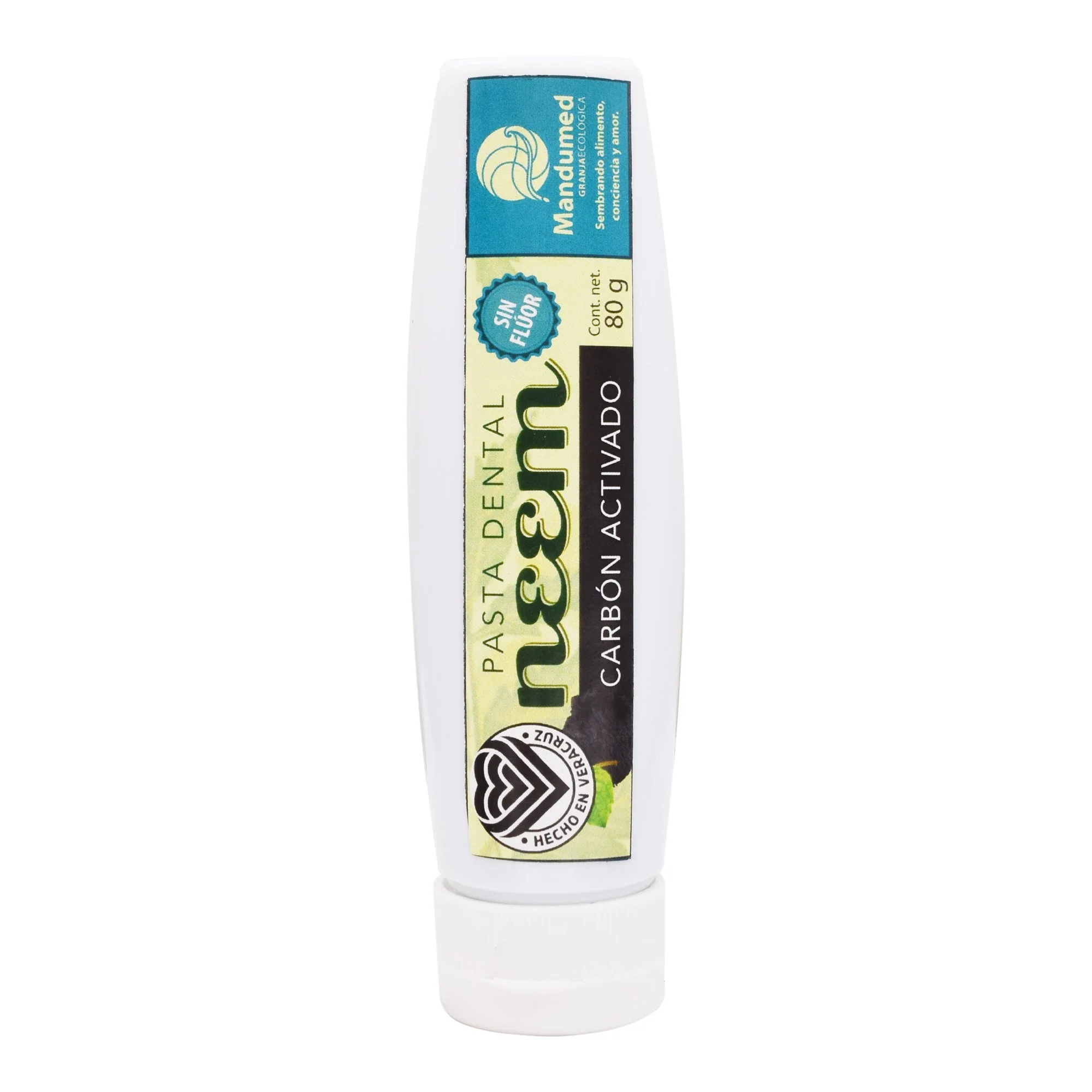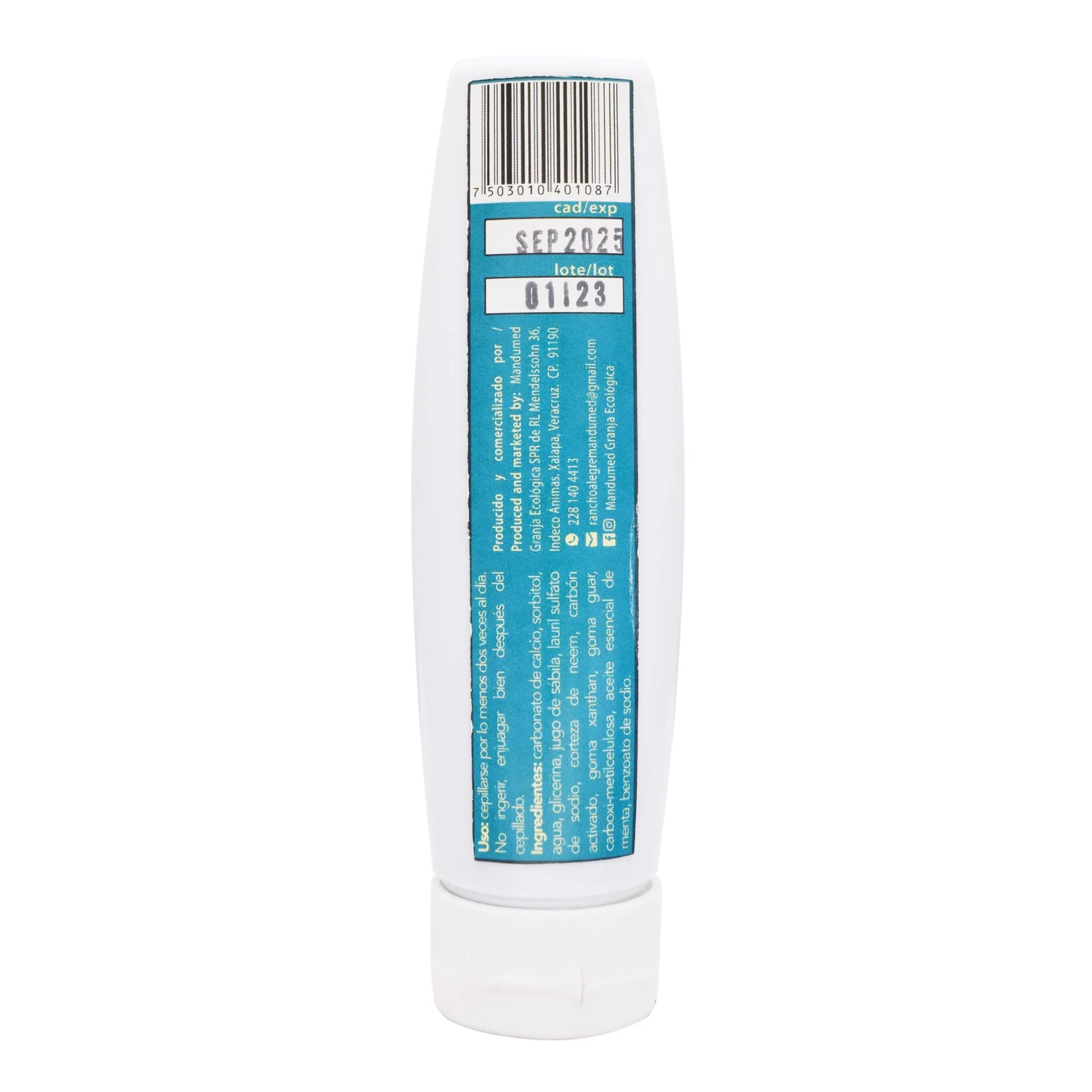 Carbonato de calcio, sorbitol, agua, glicerina, jugo de sábila, lauril sulfato de sodio, corteza de neem, carbón activado, goma xanthan, goma guar, carboximetilcelulosa, aceite esencial de menta, benzoato de sodio