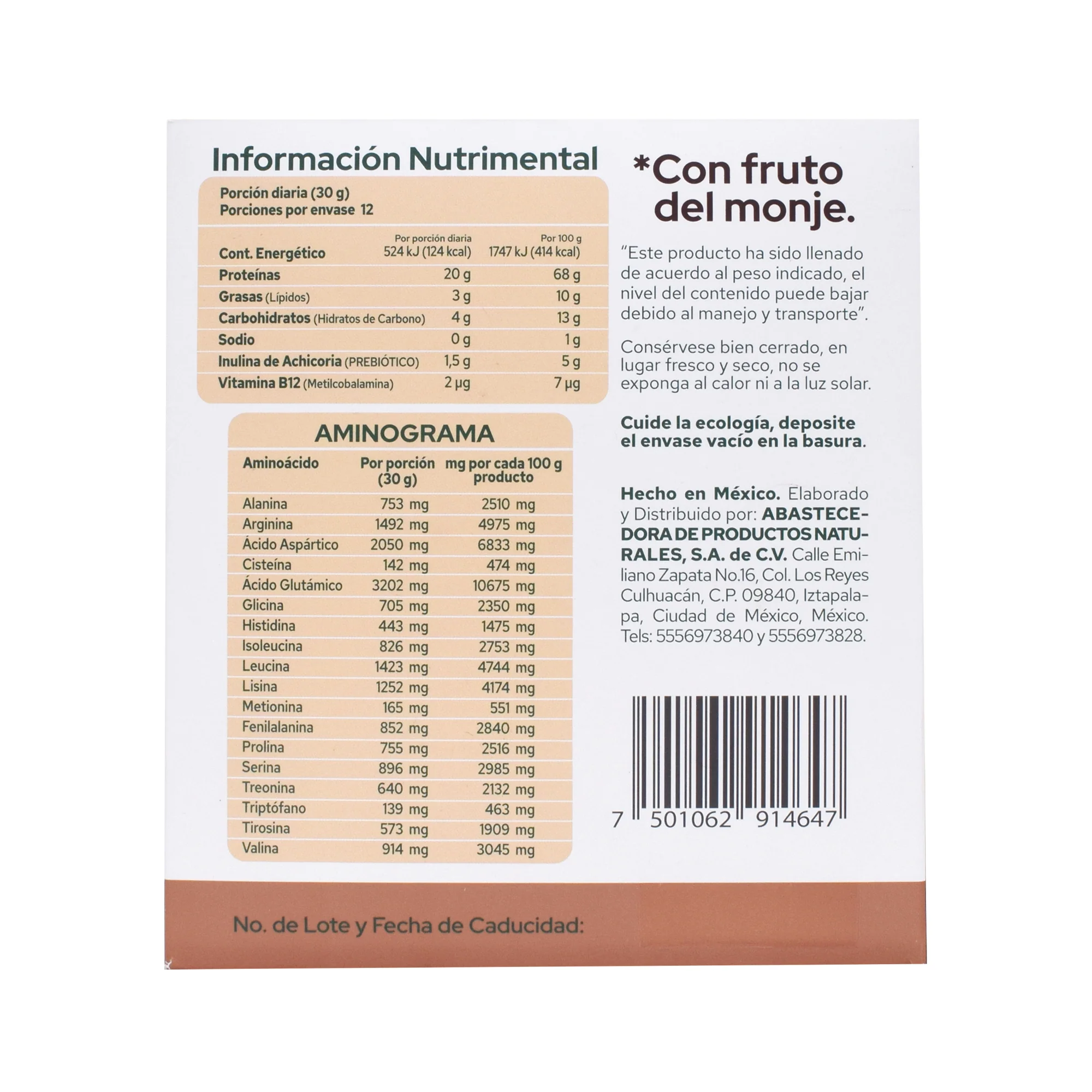 Proteina de chicharo, proteina de garbanzo, proteina de amaranto, raiz de inulina de achicoria pulverizada, proteina de arroz, harina de quinoa, sabor chocolate
