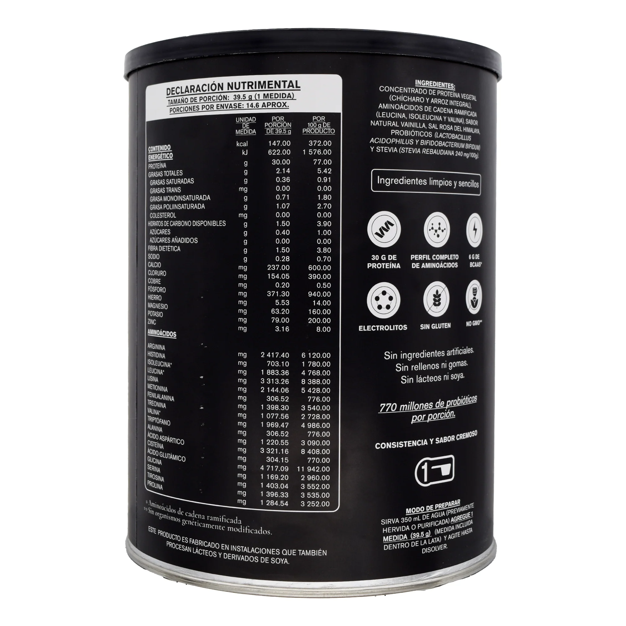Concentrado de proteina vegetal, aminoacidos de cadena ramificada, sabor natural vainilla, sal rosa del himalaya, probioticos, stevia