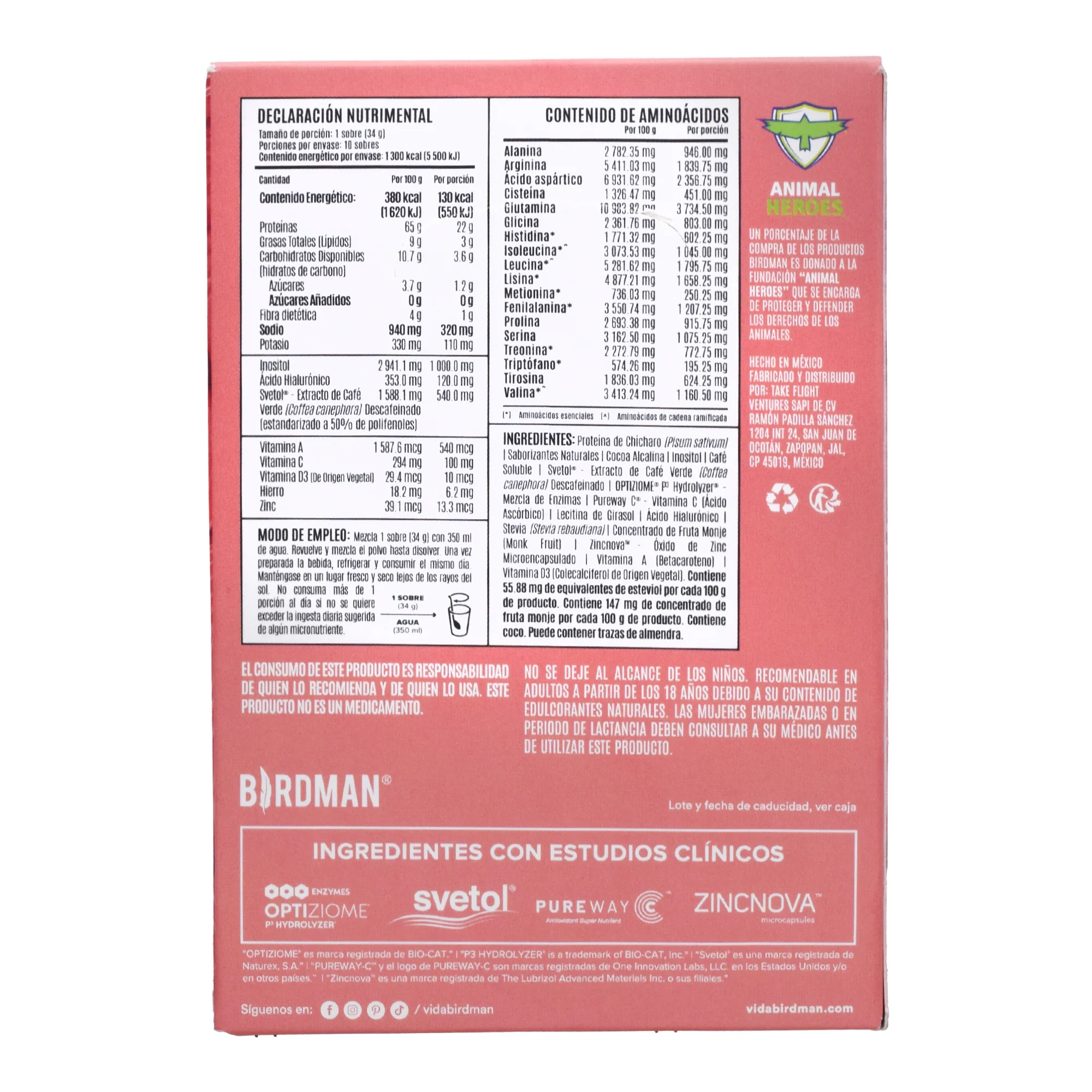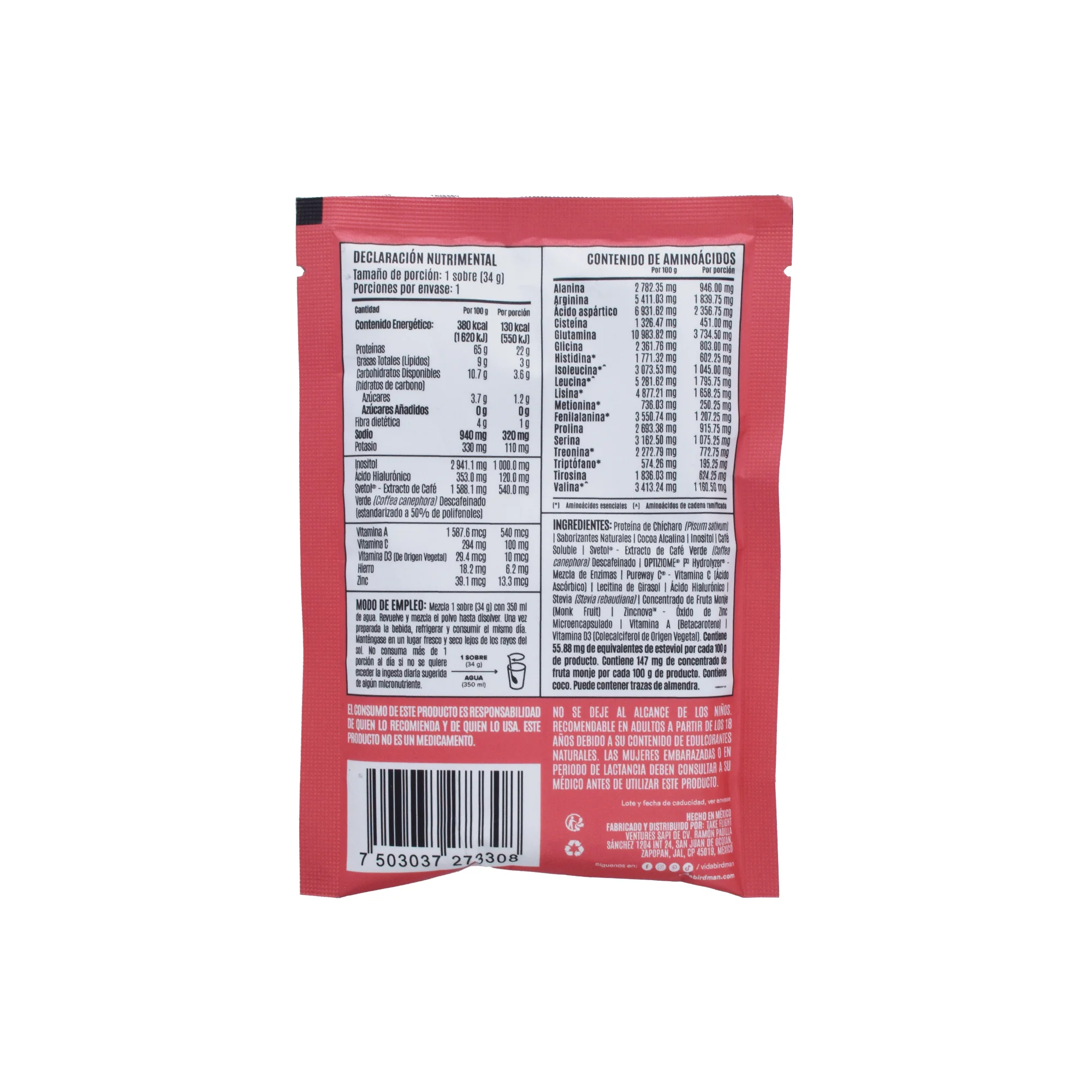 Proteína de Chícharo, extracto de café verde descafeinado, saborizante natural, vitamina C, extracto de alga spirulina azul