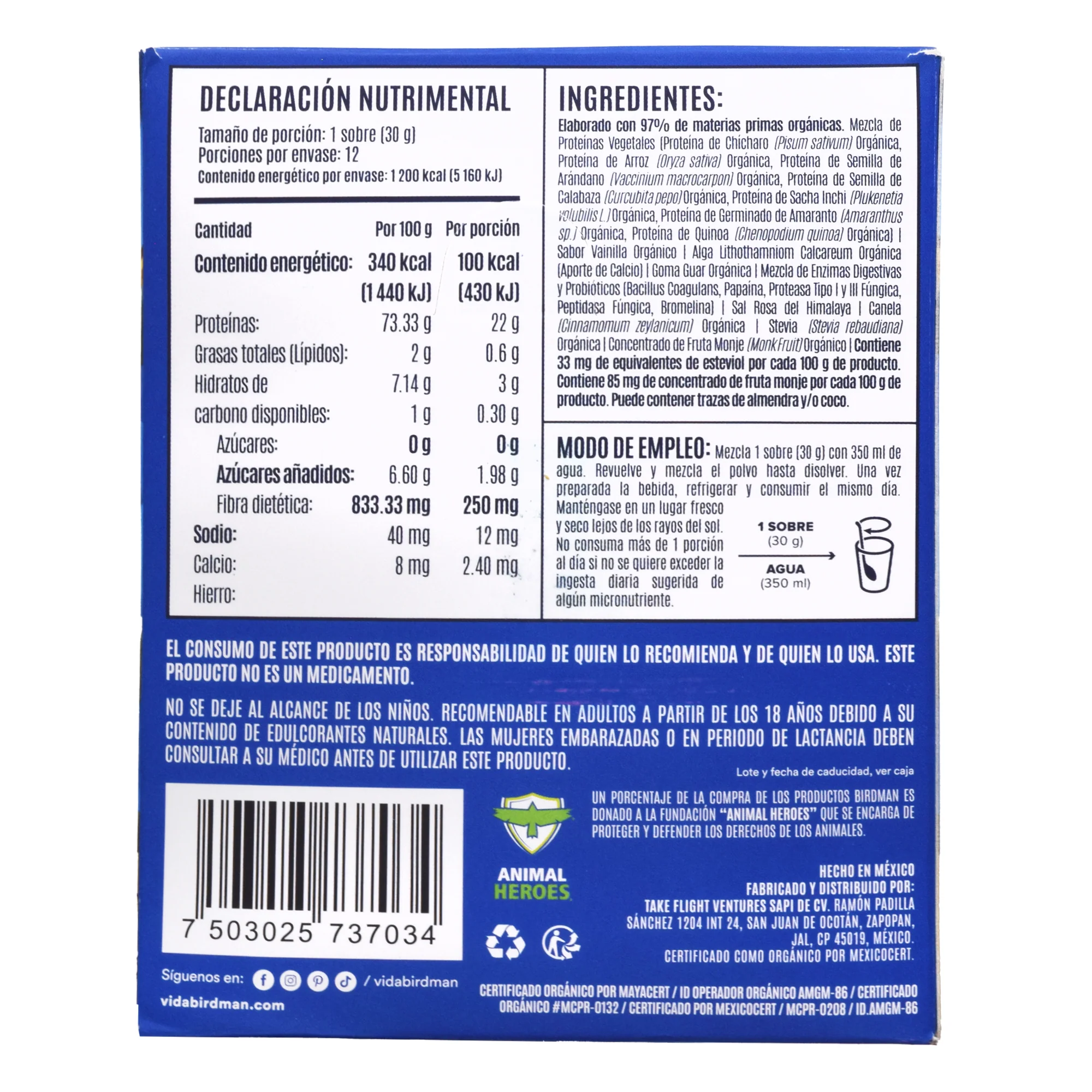 Proteína de arroz orgánica, proteína de chícharo, proteína de quínoa, proteína de semilla de calabaza orgánica, proteína de semilla de arándano, proteína de sacha inchi, sabor vainilla orgánico, enzimas, goma (guar, xantana, arábiga), stevia, probióticos, extracto de fruto del monje