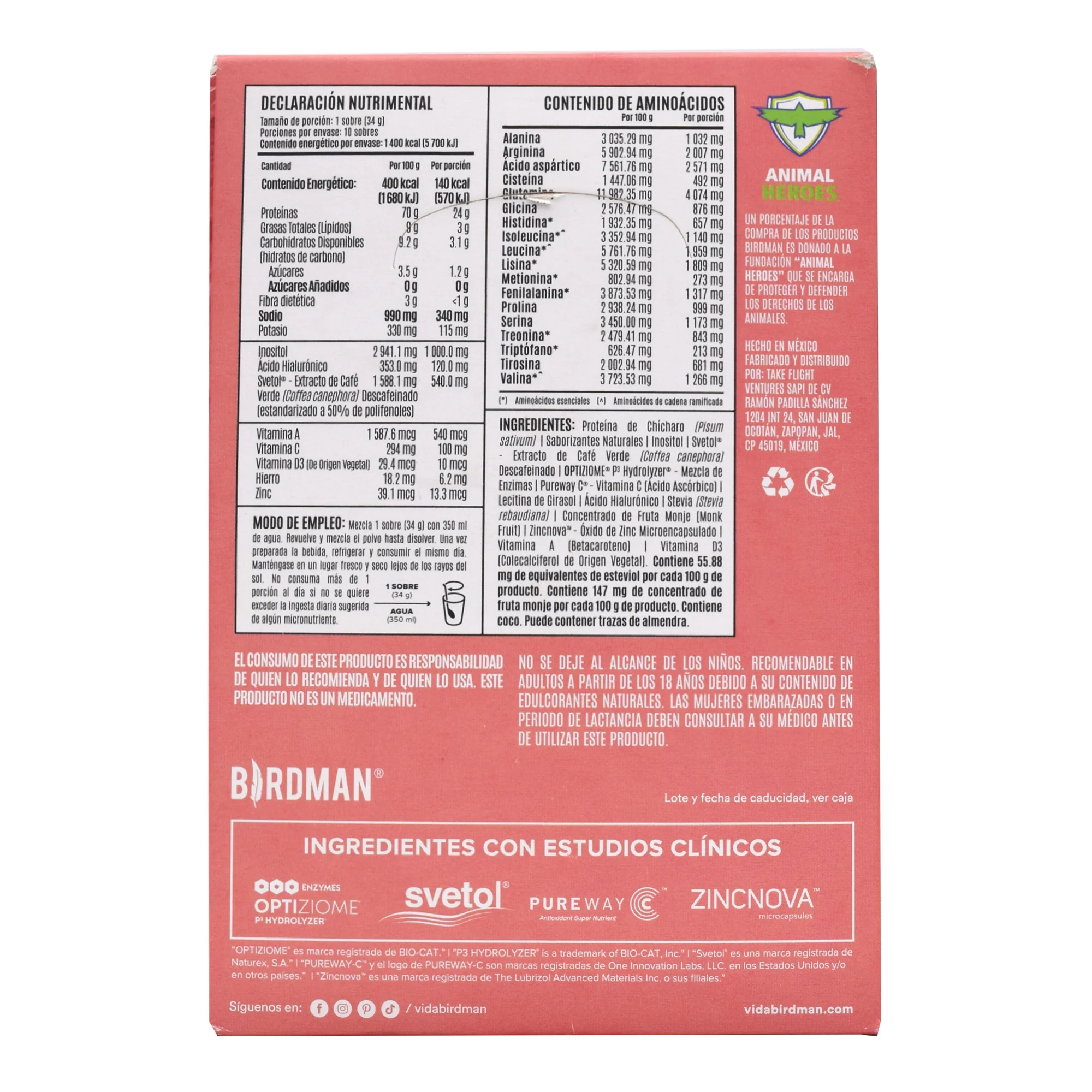 Proteína de chícharo, extracto de café verde descafeinado, saborizante natural, mezcla de enzimas digestivas, vitamina C, extracto de alga spirulina azul, ácido hialurónico, stevia, extracto de fruto del monje, óxido de zinc, vitamina A, vitamina D3