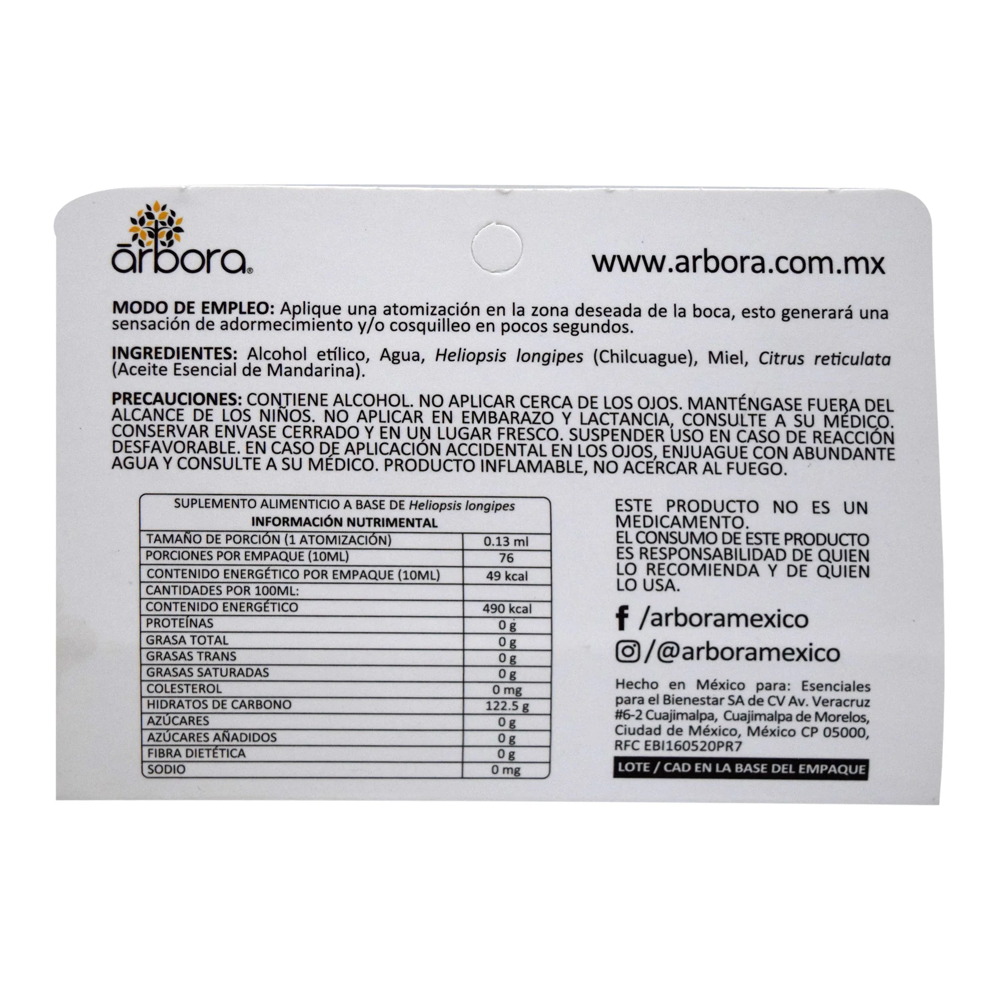Alcohol etílico, Agua, Heliopsis longipes (Chilcuague), Miel, Aceite Esencial de Mandarina (Citrus reticulata)